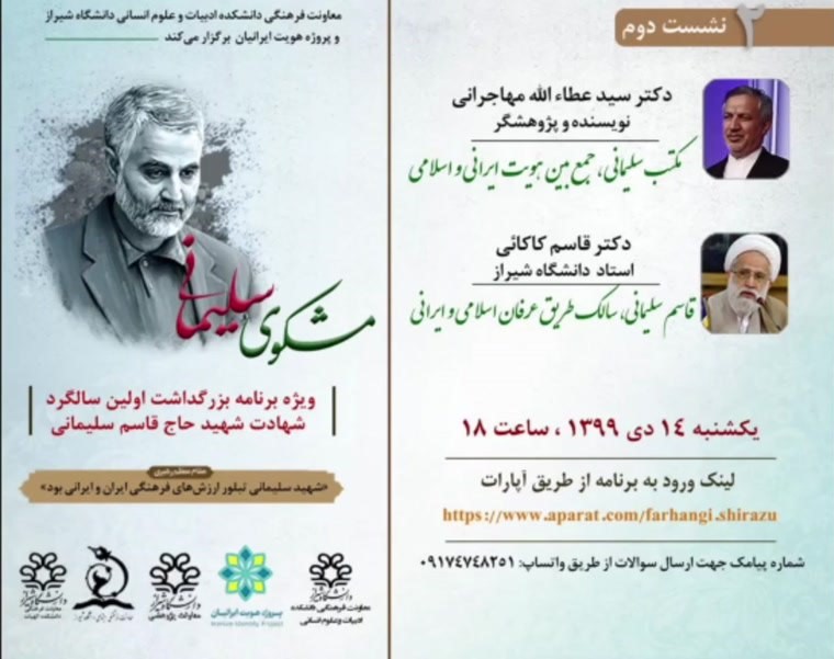 شیراز-ایرنا- به مناسبت سالگرد شهادت سردار قاسم سلیمانی مراسم یاد بودی از سوی معاونت پژوهشی و معاونت فرهنگی دانشگاه شیراز در ذیل پروژۀ هویت ایرانیان به صورت مجازی برگزار شد. در این برنامه آقایان دکتر سید عطاءالله مهاجرانی و دکتر قاسم کاکایی به سخنرانی پرداختند.